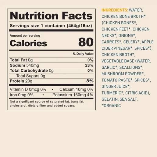INGREDIENTS: WATER, CHICKEN BONE BROTH* (CHICKEN BONES*, CHICKEN FEET*, CHICKEN NECKS*, ONIONS*, CARROTS*, CELERY*, APPLE CIDER VINEGAR*, SPICES*), CHICKEN BROTH*, VEGETABLE BASE (WATER, GARLIC*, SCALLIONS*, MUSHROOM POWDER*, TOMATO PASTE*, SPICES*, GINGER JUICE*, TURMERIC*, CITRIC ACID), GELATIN, SEA SALT. *ORGANIC